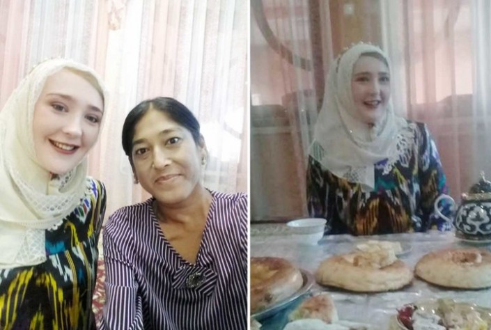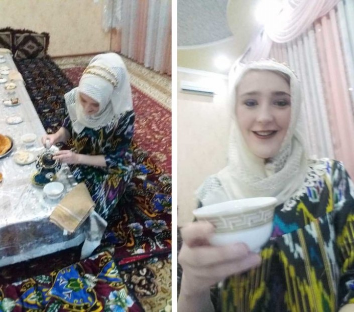 По словам европейской келин, она с легкостью привыкла к узбекскому укладу жизни и традициям. Молодая невестка подметает ранним утром двор, выполняет домашние работы и учится готовить местные блюда.