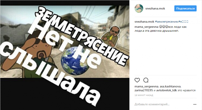 Если раньше мы могли повернуться на другой бок и спать дальше, то сейчас мы схватили детей и встали под арку. Мне было страшно. За детей. Мы живем на 10 этаже и амплитуда колебания тут больше. Прочувствовали каждую секунду", - написала пользователь Gaukhar_zhanys.