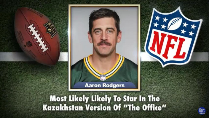 Говоря о квотербеке "Грин-Бей Пэкерс" Аароне Роджерсе, ведущий заметил: "Вероятнее всего, (ему - прим.) следует сыграть в казахстанской версии сериала "Офис". Возможно, таким образом Фэллон обыграл прическу и усы игрока, делая отсылку к фильму "Борат".