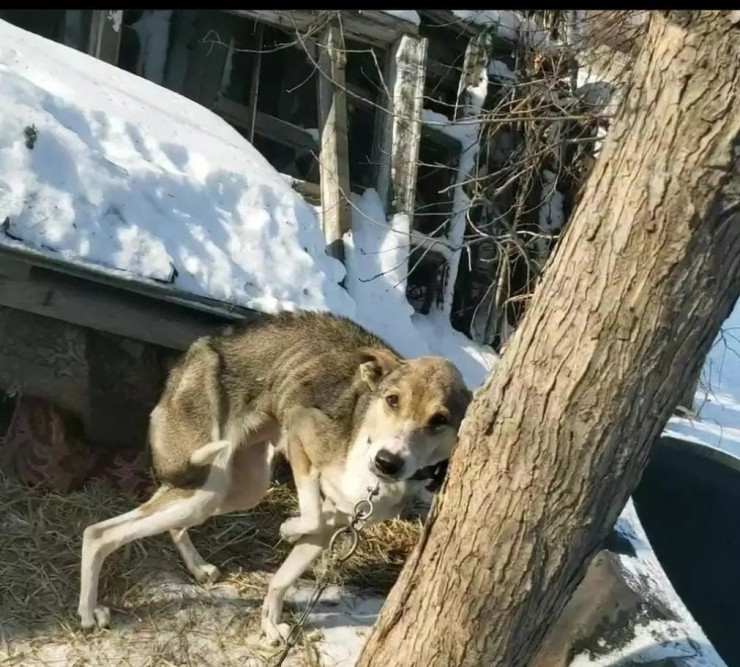 "На месте мы увидели семь собак. Они сидели на цепи возле и внутри небольших построек. А одна из собак была привязана к дереву цепью, вмерзшей в снег. Увидев нас, она пыталась лаять, но было видно, что животное сильно истощено, просто скелет обтянутый шерстью. К тому же оказалось, что у нее травмирована передняя лапа и сломаны ребра. Возможно, собака просила есть, скулила и ее били, чтобы молчала. Так издеваться над беззащитными животными и морить их голодом, могут только живодеры, нормальные люди такого не сделают", - рассказали волонтеры.