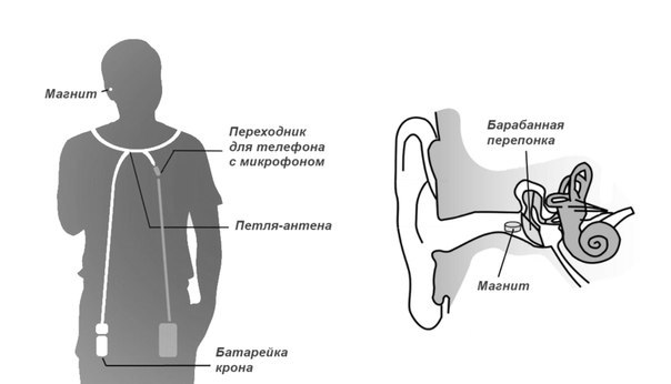 "Петлю под одежду одеваете и подключаете к телефону, в ухо вставляются динамики размером 2 миллиметра (вся система практически незаметна)", - объясняют принцип работы устройства в компании. Там же приводится схема размещения наушника.