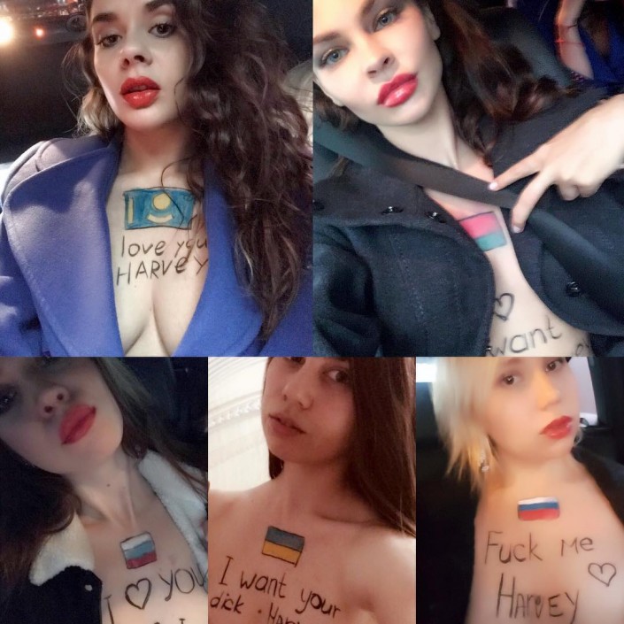 Отметим, на груди одной из девушек нарисован флаг Казахстана и надпись на аглийском: "Я люблю тебя Харви!".