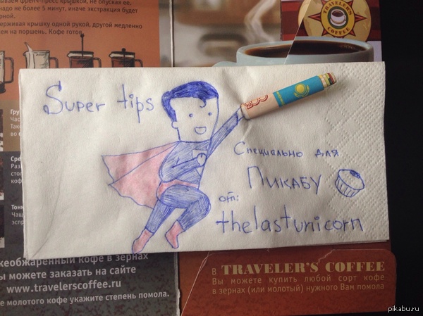Свои чаевые девушка оформляет рисунками популярных героев комиксов и мультфильмов. "На них уходит, наверное, минуты две, не больше", - говорит автор. Жангирбаева сообщила, что официанты положительно реагируют на такие картинки и даже их коллекционируют. Она отметила, что выбрала самые простые для понимания фразы на английском языке.