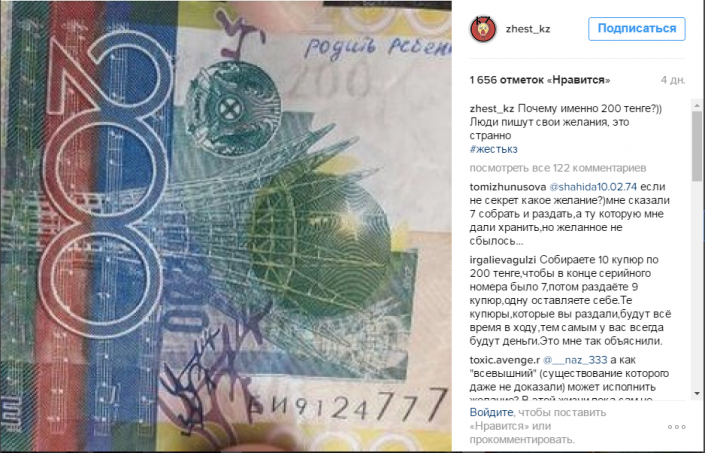 Казахстанцы начали на "удачу" писать свои желания на банкнотах номиналом 200 тенге с особым серийным номером. Образцы купюр с желаниями появились в Instagram на аккаунте "Жесть в Казахстане".