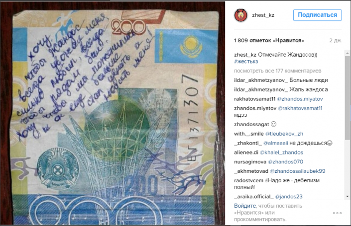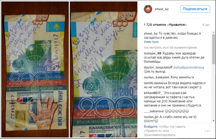 Как видно из выложенных в Instagram купюр, кто-то из казахстанцев хочет выйти замуж, кто-то родить ребенка, а одни обращаются к некоему Жандосу с просьбой "любить и уважать".