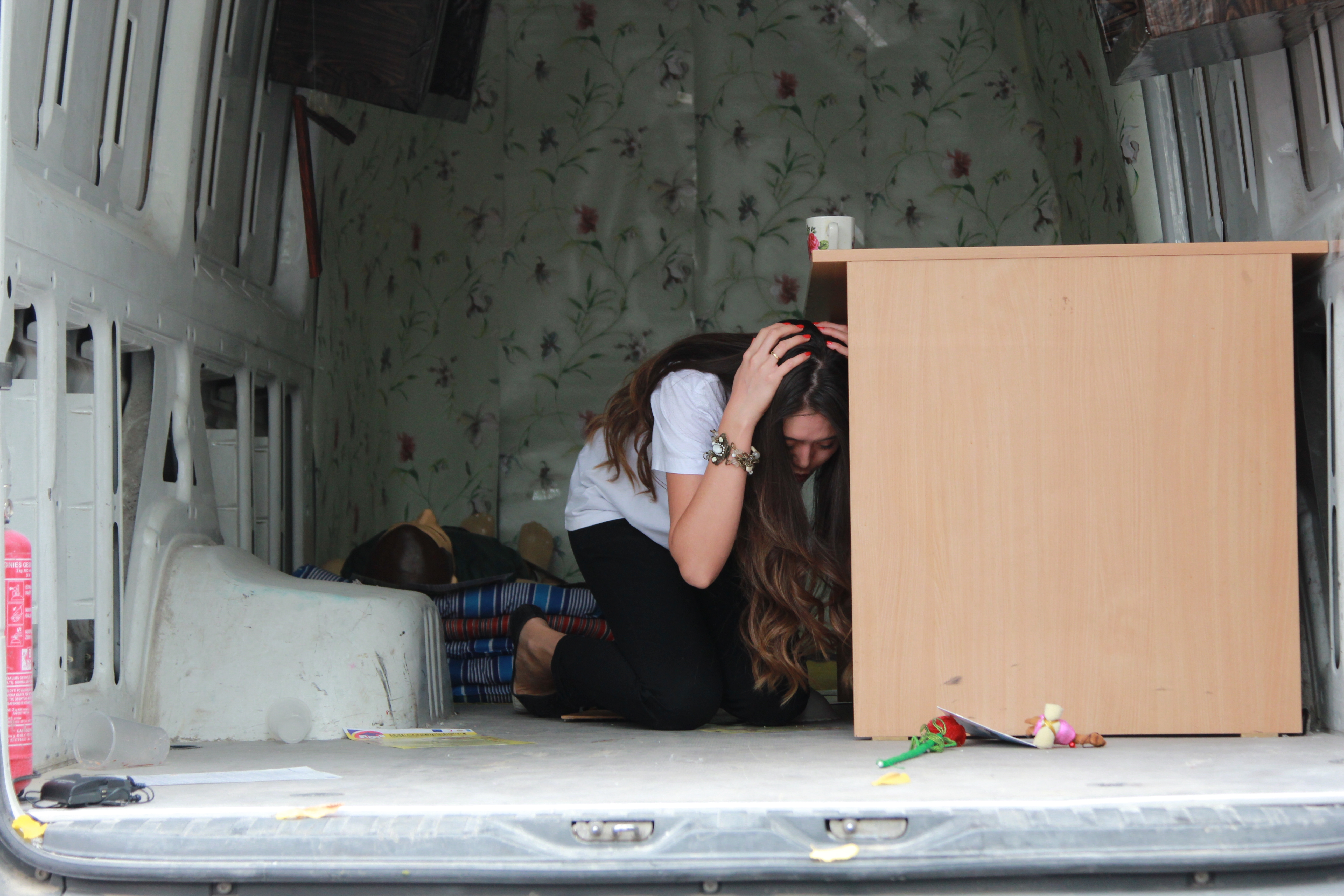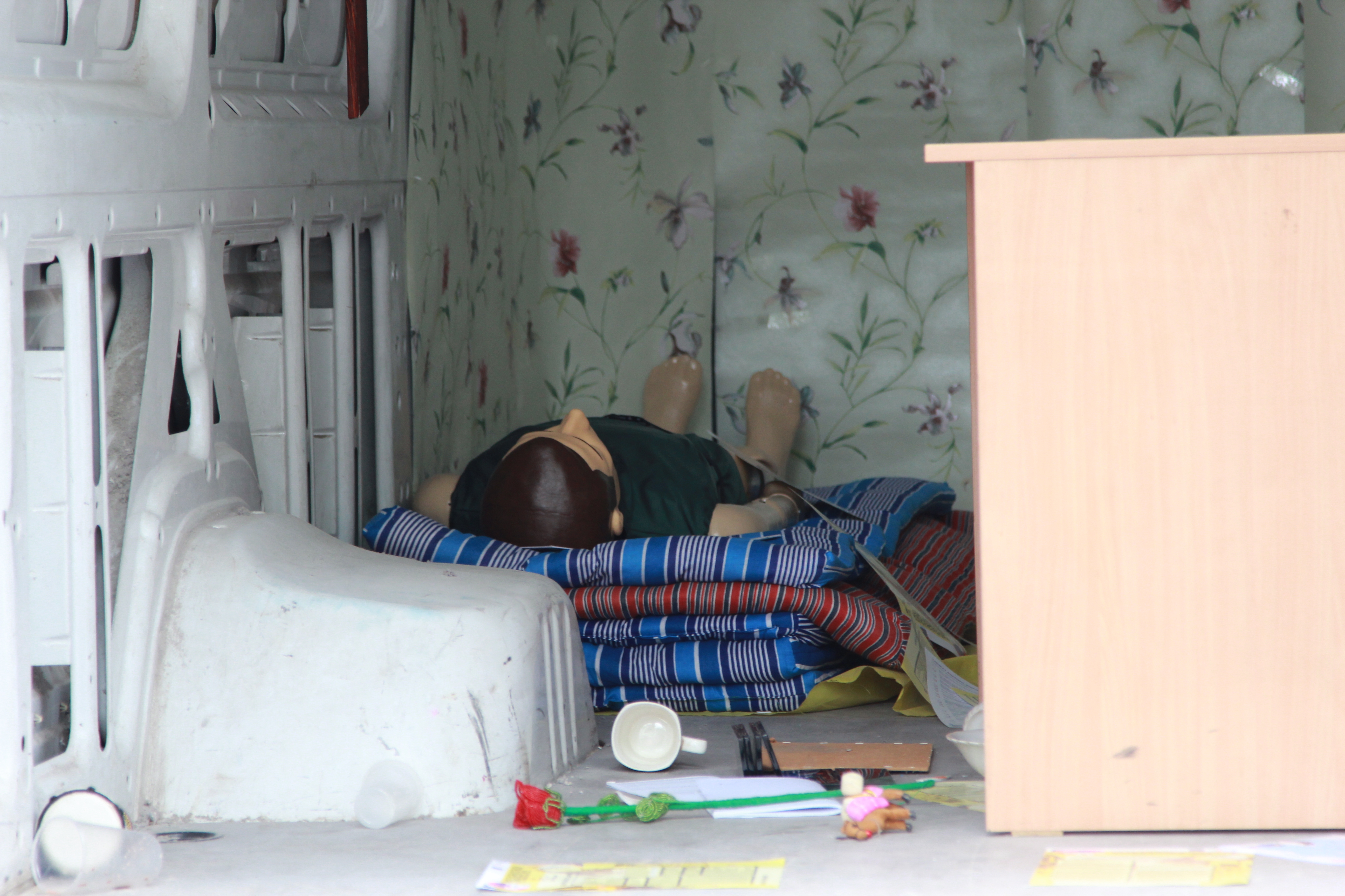Симуляционная площадка, имитирующая семибалльное землетрясение в Алматы, была представлена фургоном, в кузове которого находилась обыкновенная жилая комната - стоял стол с посудой, на стенах висели полки с книгами. По сценарию, землетрясение в Алматы происходит ночью. На примере манекена, лежащего на кровати, волонтеры показали, какую угрозу несут плохо закрепленные на стенах полки, расшатанная мебель и отсутствие "тревожного чемоданчика". Организаторы учений напомнили, что во время землетрясения не стоит выбегать на лестничную площадку, и уж тем более нельзя пользоваться лифтом. Необходимо спрятаться под стол, либо встать под дверной косяк. Лучше всего укрыть голову одеялом или пледом, чтобы защититься от осколков.