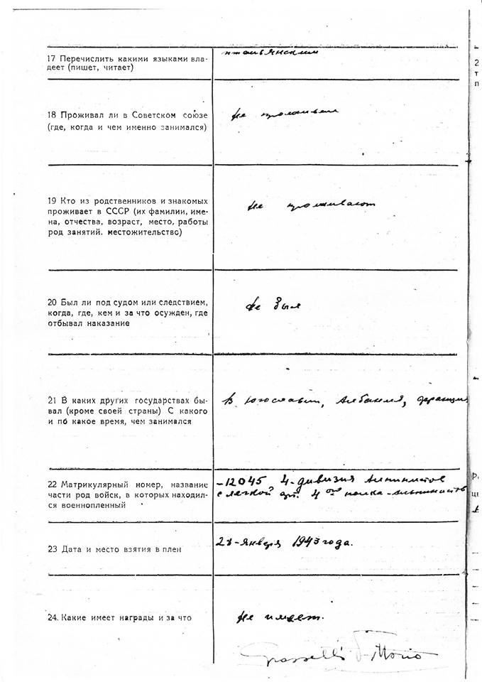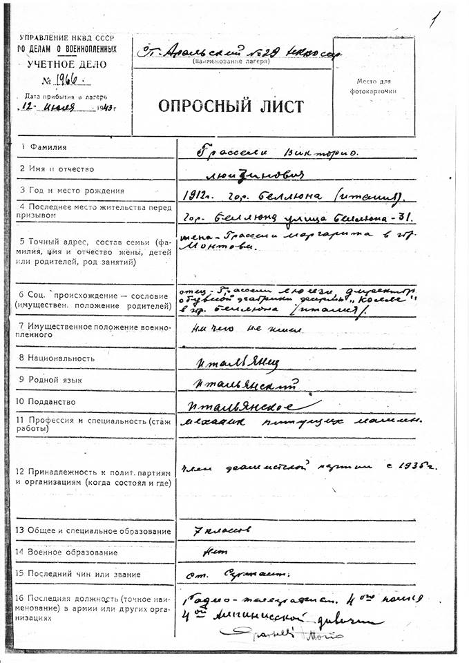 По его информации, Грассели Викторио родился в итальянском городе Беллуно 6 апреля 1912 года и служил сержантом в артиллерийском полку итальянской армии. В декабре 1942 года он был захвачен в плен на территории СССР во время боев в Ростовской области вблизи реки Дон.