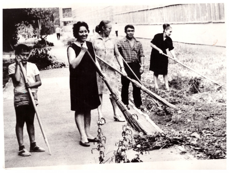 "Это был субботник на ковровой фабрике. Моя мама в центре в светлом платье. Я иногда бывал у нее на работе. Эта фабрика была одной из ведущих, но закрылась в 2000-х из-за конкуренции. Тогда на рынок хлынули дешевые синтетические ковры со всего мира и шерстяные из Монголии", - делится Тимур.