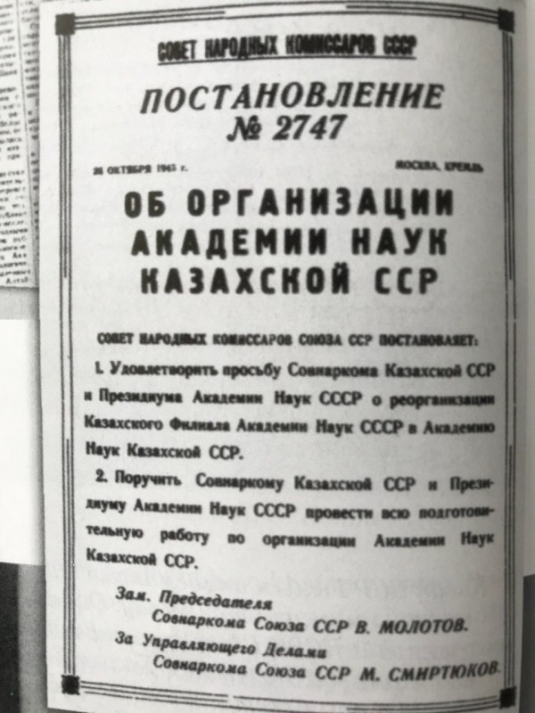 В течение пяти лет Сатпаев собирал ученых, взращивал кадры. Видя результаты его работы, президент Академии наук СССР Владимир Комаров написал представление в правительство КазССР об организации самостоятельной республиканской Академии наук. 1 июня 1946 года в Алма-Ате открылась Академия наук КазССР.