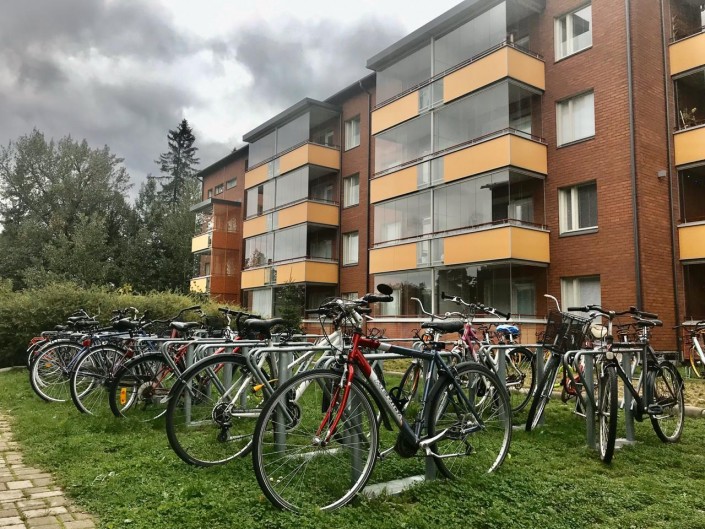 Поселили казахстанцев вот в таких меблированных квартирах. Кадеты живут по двое в трехкомнатных квартирах обычных жилых домов. Велопарковка на переднем плане - обычное зрелище для каждого дома.