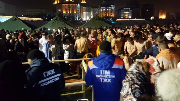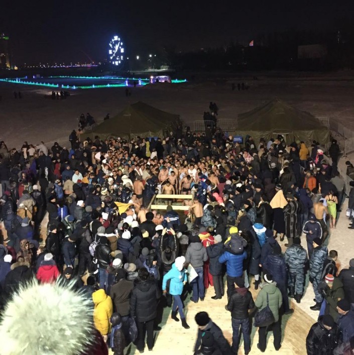 К примеру, в Астане, на набережной реки Есиль выстроились очереди. Желающих окунуться в ледяную воду не смутили ни морозы, ни позднее время суток. На месте дежурили спасатели, медики, были установлены палатки.