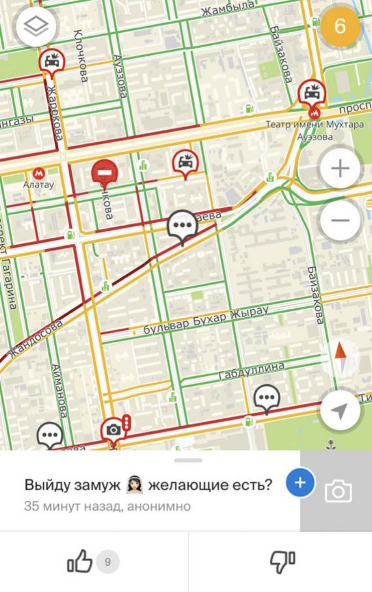 Таксист бұлай ағынан жарылған кезде бірнеше минут бойы қозғалыссыз тұрғанбыз. Амал жол, картадан кептелістерді көрсететін картаны ашып, қарап отырдым. Көшенің көбі қызыл түске боялған - кептеліс деген сөз.