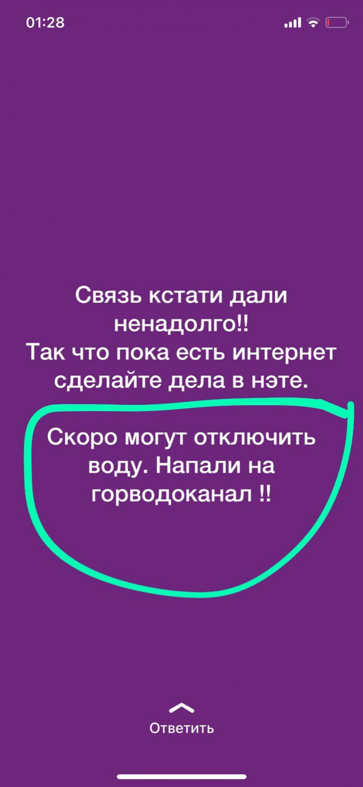Әлеуметтік желілерде Алматыда электр қуаты мен су беру тоқтауы мүмкін деген ақпарат тарады. Хабарламада бұған "қалалық су арнасына шабуыл жасалғаны" себеп болуы мүмкін екені айтылады.