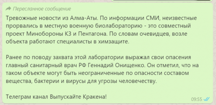 StopFake мәліметінше, әлеуметтік желілер мен мессенджерлерде белгісіз біреулер Алматы маңындағы әскери биозертхананы басып алғаны туралы ақпарат тарады.