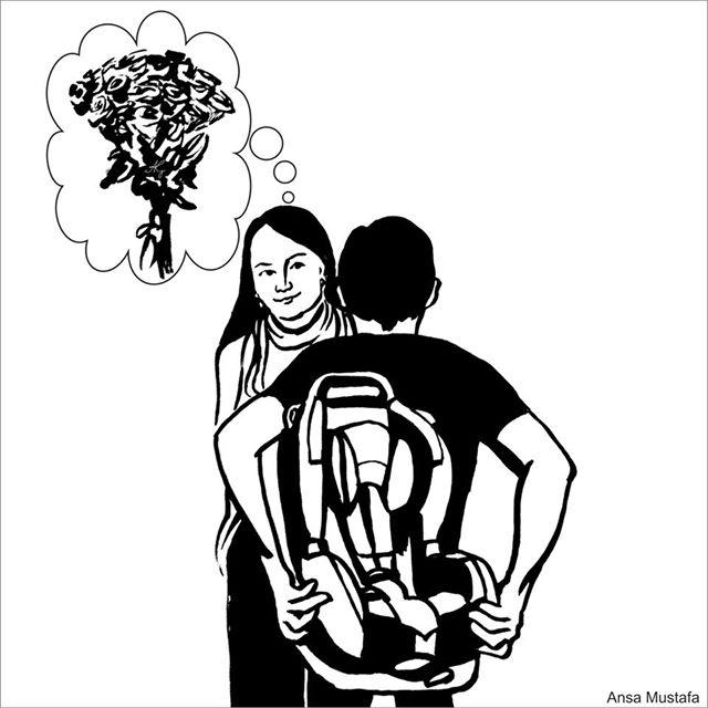 Казахстанская художница Ансаган Мустафа также посвятила несколько работ теме детских автокресел. К примеру, на одной из картин изображены девушка и парень. Девушка, видя, что молодой человек приготовил ей сюрприз, думает, что у него за спиной спрятаны цветы, однако кавалер решил преподнести ей в подарок... детское автокресло.