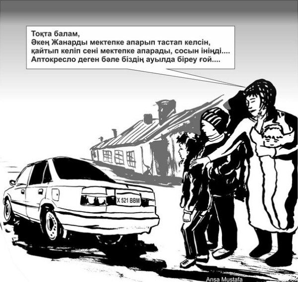 На другой картине автора Ансаган Мустафа изображена мать с тремя детьми, которая говорит одному из них: "Постой, пусть отец отвезет в школу Жанар, потом младшего брата. Ведь автокресло в нашем ауле только одно".