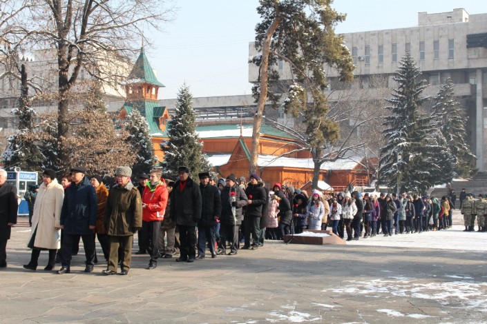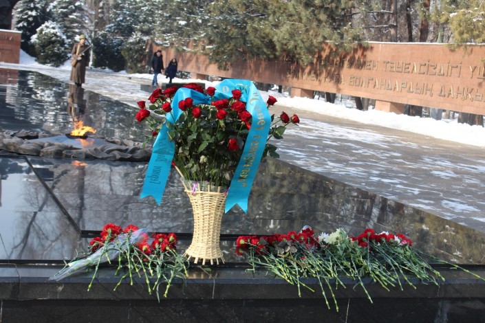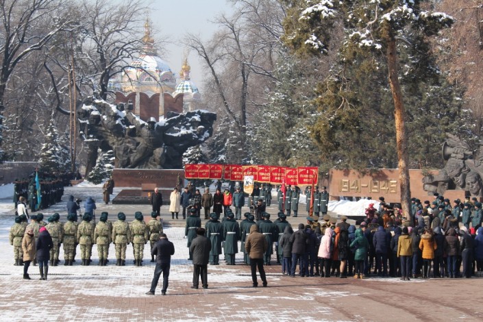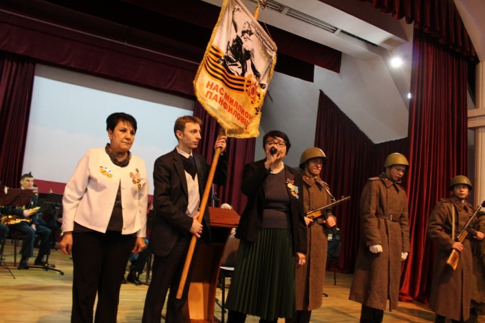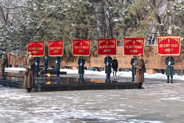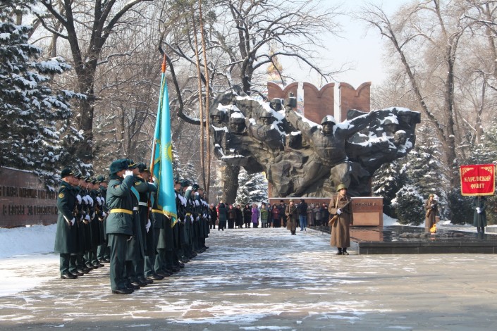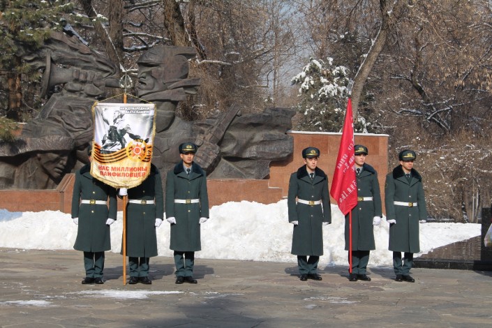 Все они собрались у мемориалов Воинской славы и Вечного огня, чтобы почтить память и возложить цветы. Позже в концертном зале Дома офицеров прошла передача знамени 316-й стрелковой дивизии представителям Екатеринбурга - следующего города вахты памяти, а также там были показаны фрагменты документального фильма "Батыры Великой степи". Эта кинолента рассказывает о воинах Панфиловской дивизии, сражавших под Москвой.