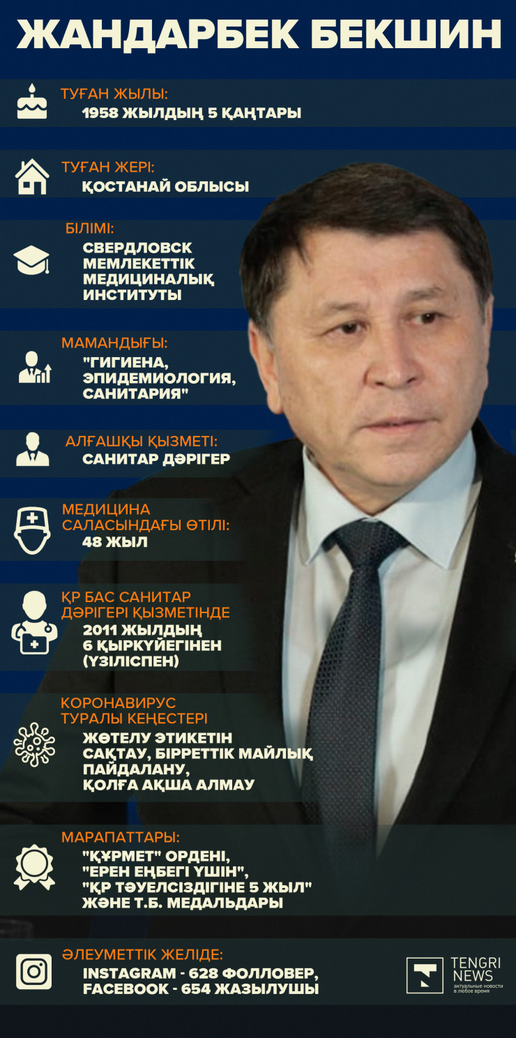Әлемге коронавирус пандемиясы тарап жатқанда Қазақстан да қауіпті вирустан сақтану шараларын бастады. Осы тұста еліміздің бас санитар дәрігері Жандарбек Бекшин түрлі мәлімдеме жасап, ел аузында болған. Tengrinews.kz тілшісі Жандарбек Бекшин туралы деректер жинады.