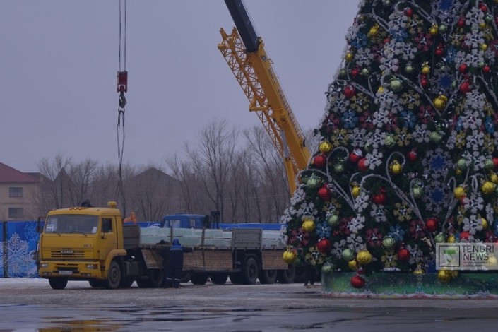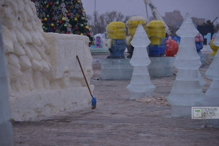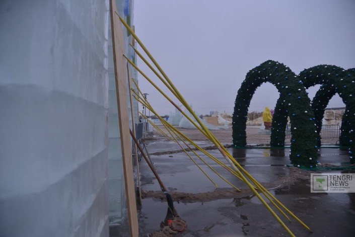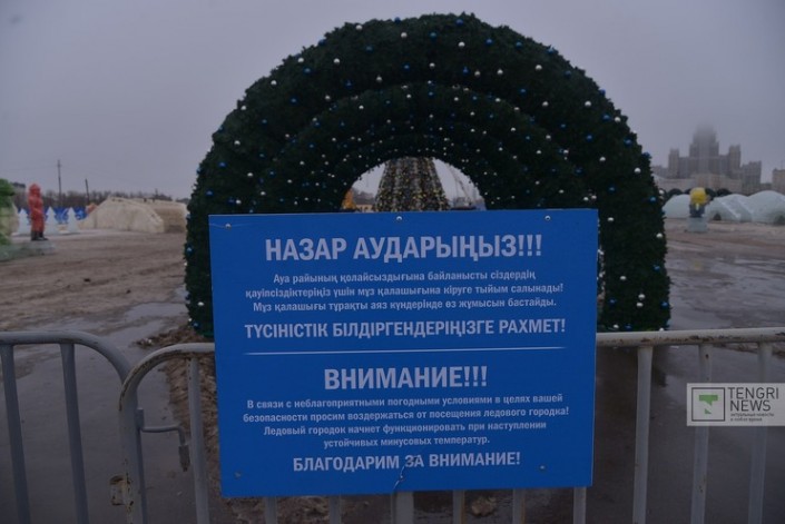 По словам другого сотрудника, ледовый городок был закрыт по решению властей города. "Акимат сказал, и нас закрыли в связи с тем, что все тает. Конструкции тают и в любое время могут на кого-то рухнуть. Эти фигуры из льда же. Они не упадут сейчас, конечно, но зачем нам гадать. Погода видите какая. Как морозы придут, работы закончим сразу. Лед привозят. Машина по изготовлению льда работает, а искусственный снег пока не делается", - рассказал другой рабочий по имени Данат.
