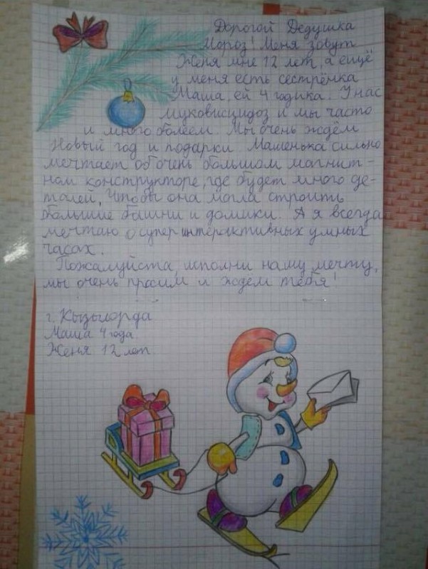 В Казахстане стартовала акция "Я - Дед Мороз! Я - Снегурочка!". Инициаторы проекта - команда "#Я рядом" - получили более 600 писем от онкобольных детей и детей с диагнозом ДЦП. По их словам, большинство малышей просили подарить игрушки, одежду, велосипеды, но были и те, кто нуждается в лекарствах и препаратах. Редакция Tengrinews.kz собрала несколько детских посланий Деду Морозу.
