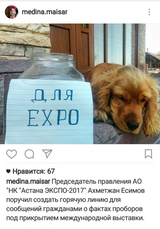 В числе последних публикаций девочка высказалась о символах EXPO-2017 - Сауле, Мольдир и Куат. "Мне, как казахстанке, стыдно и неприятно за такие вещи. Я очень хочу, чтобы EXPO прошел красиво и достойно", - говорит Медина.