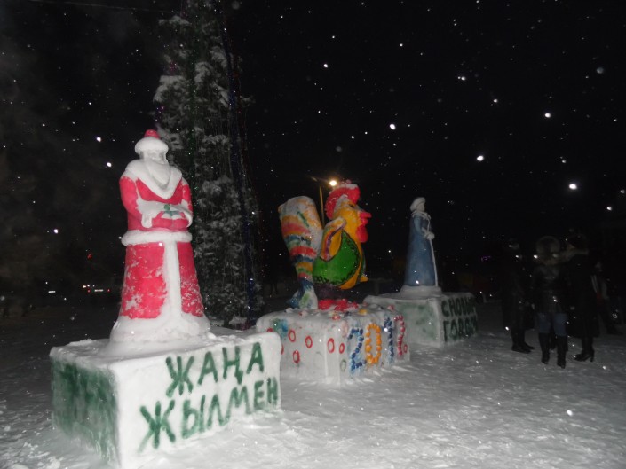 Снежный городок возвели еще в декабре. Основными темами вдохновения для умельцев стали 25-летие Независимости страны и предстоящая выставка EXPO-2017. Также мастера-любители слепили несколько мультипликационных персонажей, Деда Мороза, Снегурочку и символ года - петуха.