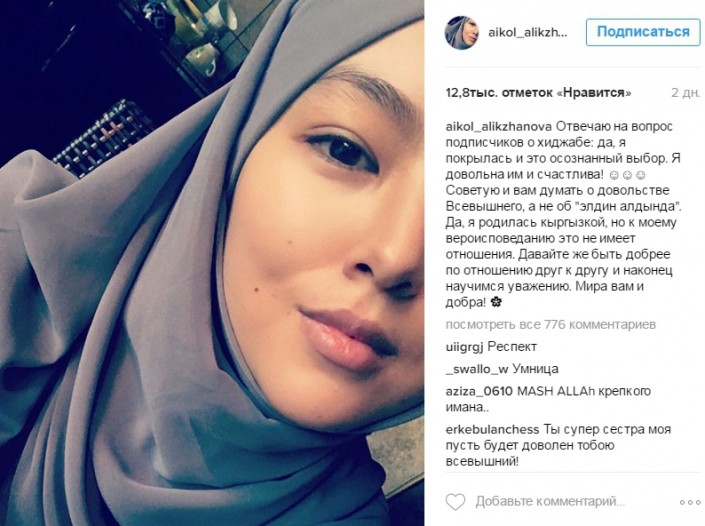 "Отвечаю на вопрос подписчиков о хиджабе: да, я покрылась, и это осознанный выбор. Я довольна им и счастлива! Советую и вам думать о довольстве Всевышнего, а не об "элдин алдында". Да, я родилась кыргызкой, но к моему вероисповеданию это не имеет отношения. Давайте же быть добрее по отношению друг к другу и, наконец, научимся уважению. Мира вам и добра!" - написала она.