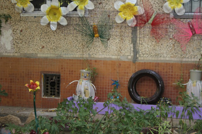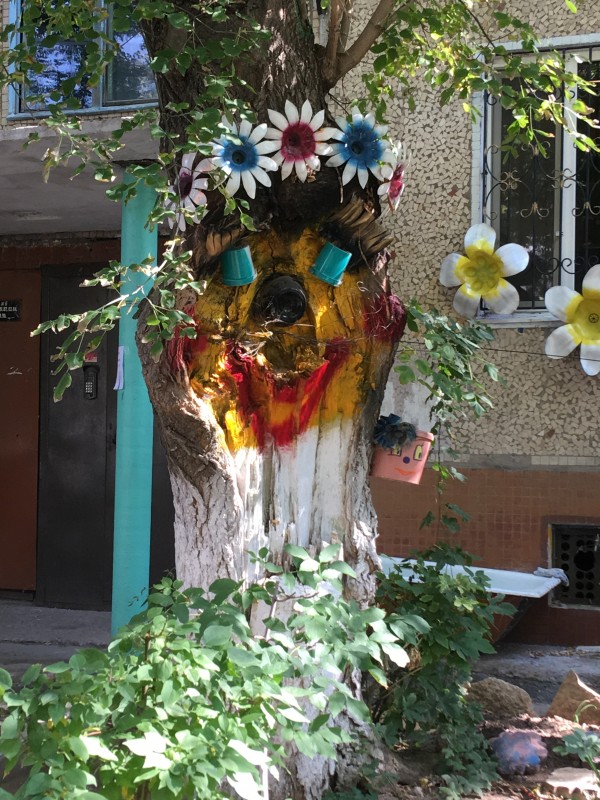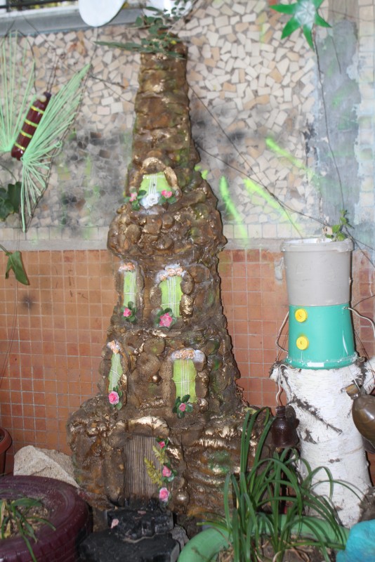 Она признается, что, когда начинала это дело, немного побаивалась, как отнесутся к этому люди и получится ли уберечь палисадник от тех, кто вдруг захочет все сломать. "Но оказалось все наоборот. Наши соседи довольны, что у нас такая красота, прохожие останавливаются, фотографируются. Воспитатели из детского сада, расположенного за нашим домом, стали приводить сюда группы ребятишек. Я стала для деток делать поделки всякие и выставлять их во двор. Находила материал какой-то - ведра пластиковые, баночки-скляночки, все это собирала, вырезала, клеила. Потом ко мне муж присоединился, потом дети потихоньку, потом мы красить это все начали. А в какой-то момент меня попросили оформить участок в детском садике. КСК нам в помощь вывел воду, так что мы теперь можем поливать наш палисадник", - рассказывает Наталья.