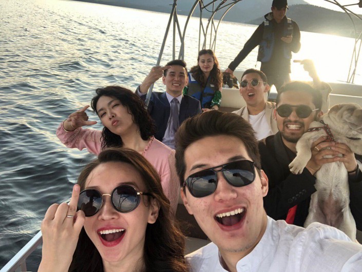"Мы взяли с собой костюмы, еду, платье, фату. Надели костюмы, девушки надели платья, и все отправились кататься на катере. Поездка по озеру была для нас бесплатной, это был подарок друга. Капитан нашего судна остановился в красивом месте посередине озера. Светило солнце, горы вокруг, все было очень романтично, даже волшебно. Там мы прочли друг другу клятвы. Капитан корабля зачитал речь, объявил нас мужем и женой, мы обменялись кольцами и поцеловались", - рассказал Куаныш.
