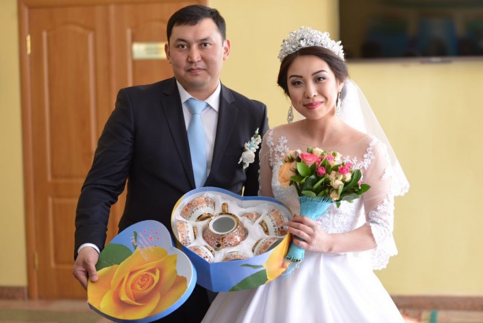 "Мы познакомились в парке, я гулял с друзьями, она с подругами. Мы встречаемся, кстати, с Дня города. Совпадает, что в День города познакомились, на выборы свадьба. Думаю, если ребенка к 16 декабря, так вообще отлично будет", - пошутили молодожены Лаура и Бердымурат Жусуповы.