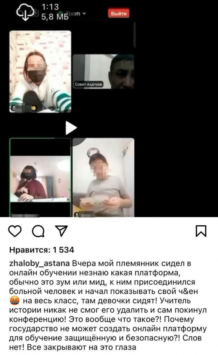 "Учитель никак не мог его удалить и сам покинул конференцию. Почему государство не может создать онлайн-платформу для обучения, защищенную и безопасную? Слов нет, все закрывают на это глаза", - пожаловался автор поста.