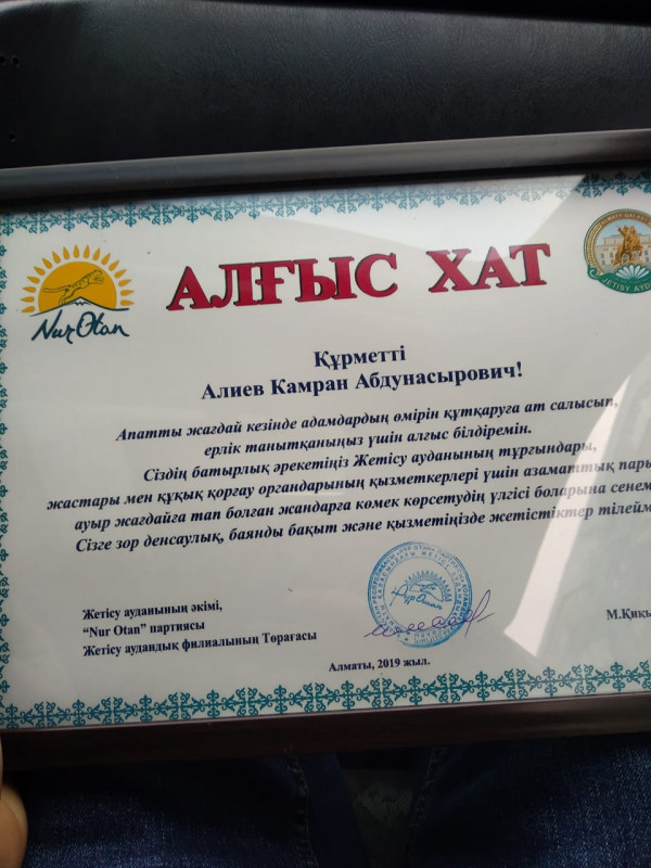 "Благодарим вас за помощь гражданам в чрезвычайной ситуации. Ваше мужество - яркий пример для людей, столкнувшихся с трудными жизненными ситуациями. Это пример для жителей Жетысуского района, для молодежи и правоохранительных органов. Желаем Вам крепкого здоровья, счастья и благополучия", - говорится в благодарственном письме.