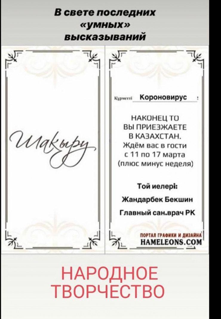 Высказывание главного государственного санитарного врача Жандарбека Бекшина о том, что первый случай коронавируса в Казахстане может быть зарегистрирован в ближайшие дни, разлетелось на мемы, передает корреспондент Tengrinews.kz.