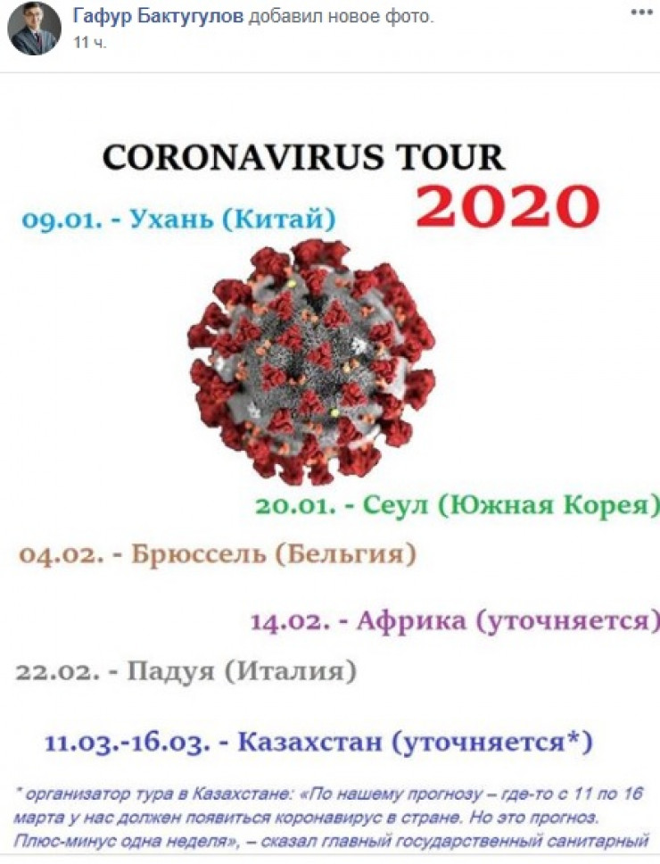 "По нашему прогнозу, где-то с 11-16-го у нас должен быть, все же наконец-то появится коронавирус в стране. Но это прогноз. Плюс-минус одна неделя… Как только у нас появится коронавирус, мы сразу введем специальные мероприятия", - сказал Бекшин.