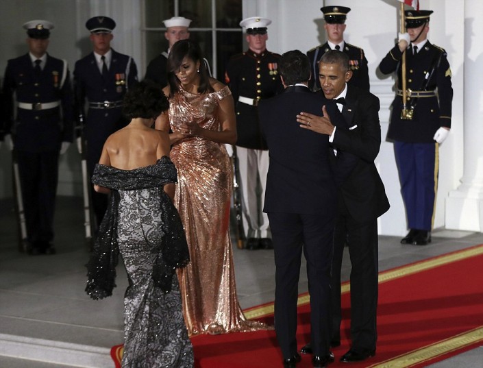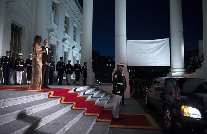 Впрочем, наибольшее внимание в этот вечер привлекла Мишель Обама. Она появилась перед гостями в ослепительном платье от Versace оттенка розового золота. Модель получила название Flotus. Наряд с ассиметричным кроем "на одно плечо" и сложными драпировками из ткани с металлизированной фактурой напоминал жидкое золото, струящееся вдоль тела.