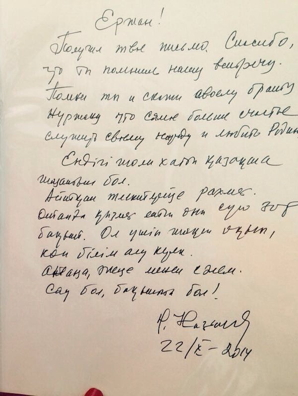 "А 21 октября сыну исполнилось десять лет. Перед этим мы обсуждали, как будем отмечать, каких друзей пригласим - одноклассников, соседей. И тут Ержан спрашивает: "Папа, а давай Президента пригласим на мой день рождения, что для этого нужно сделать?" Ты своих друзей как зовешь? Пригласительный отправляешь, вот и ему напиши", - ответил я. Ержан с нашим старшим сыном Нуржаном убежали в детскую и минут через 40 принесли мне письмо. Я удивился. На следующий день мы вместе отправились на "Казпочту", Ержан подписал: Президенту лично в руки", - пояснил Бауржан Исабаев.