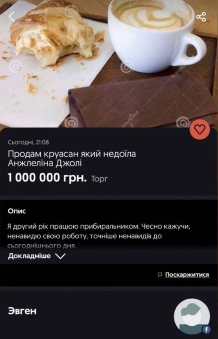 Житель Украины по имени Евгений выставил на продажу круассан, который, по его утверждению, не доела в кафе Анджелина Джоли во время визита во Львов 30 апреля. Скриншот объявления обнародован в Сети.