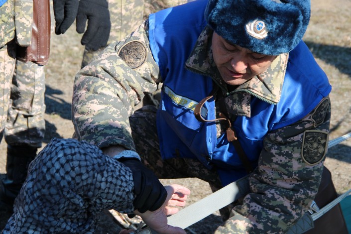 Прежде чем приступить к тренировке по наземным элементам прыжка, нужно внимательно ознакомиться с мерами безопасности и запомнить их. Главное - не впадать в панику, говорят десантники. В момент отделения от вертолета парашютисту нужно сложиться "каплей" - голову опустить к груди, правая рука на кольце парашюта, вторая в области живота. Важно также, чтобы ноги были собраны вместе и согнуты в коленях, чтобы не травмировать их в момент столкновения с землей, объясняют они.