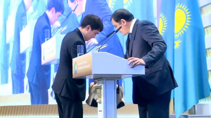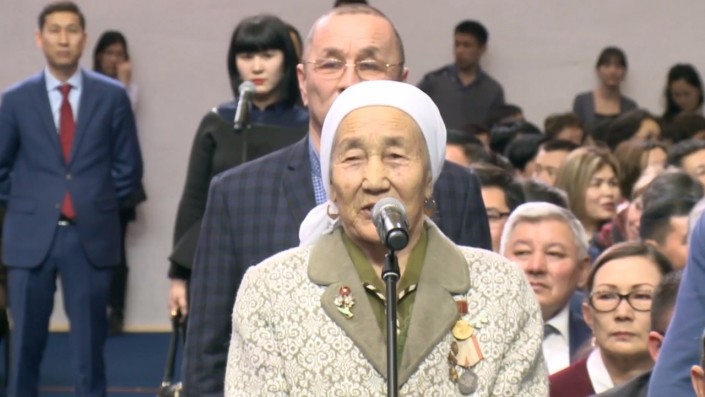 "Благодарим Вас за Ваше выступление! Мы узнаем о выделении средств (на развитие региона - прим. автора) через СМИ. Мой дорогой, пускай эти начинания продолжатся. Мы радуемся, что наша область на первых местах. Спасибо вам! Айналайын, я хочу тебя благословить. Я принесла вам вкусный подарок и хочу его вручить. Живите до ста лет!" - сказала она.