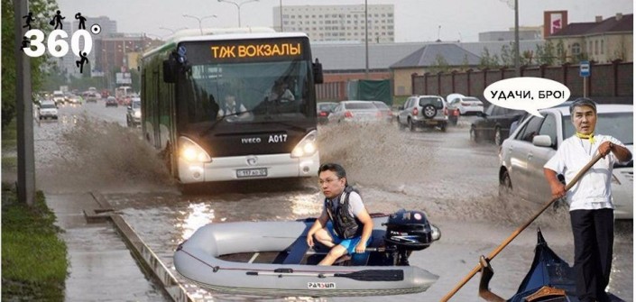 После назначения Бахыта Султанова на пост акима Астаны в Сети появился мем о "передаче" должности. Авторы картинки обыграли ливень в столице, "поплывшие" автобусы и астанчан на надувной лодке.