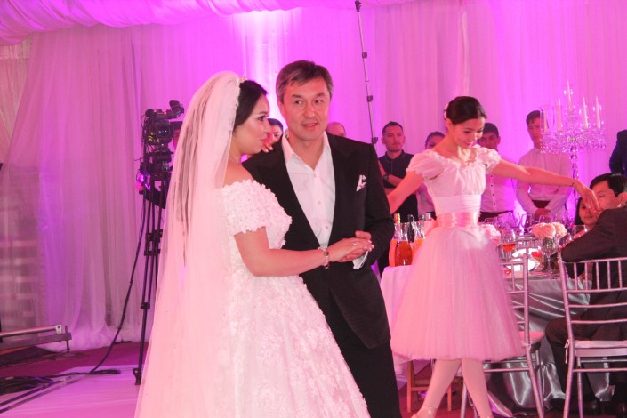 Уже на большое торжество невеста поменяла наряд на платье с длинным шлейфом и фатой. К мужу ее вел под руку отец - бизнесмен Раимбек Баталов.