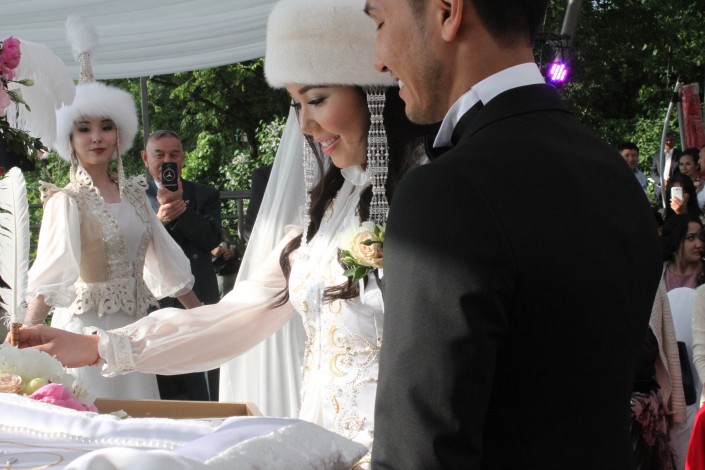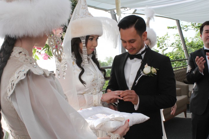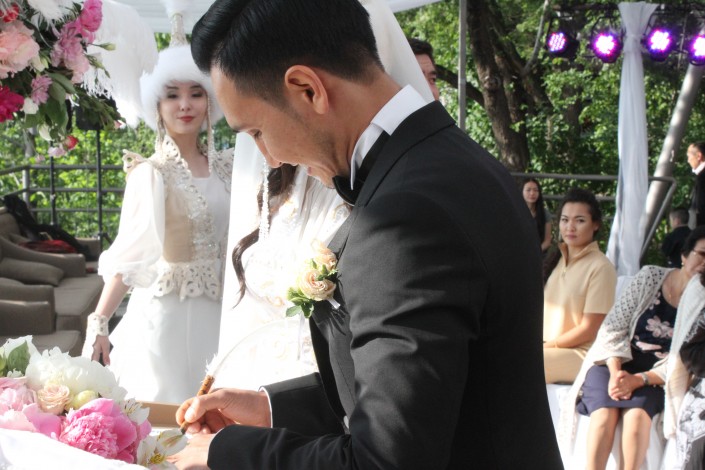 После этого перешли уже к официальной регистрации брака. Молодые принесли друг другу клятву верности и обменялись кольцами. Церемонию провела самая знаменитая сваха страны Айгуль Бабаева.