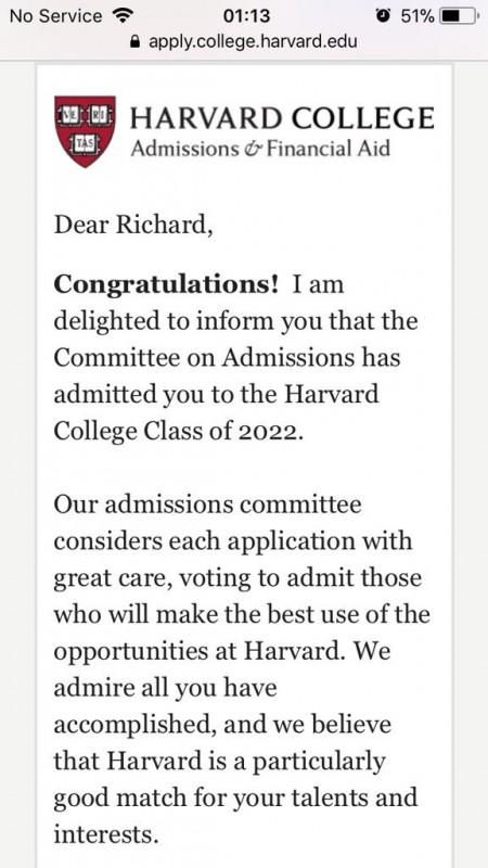 О своем поступлении в Гарвард Ричард узнал, когда вместе с классом был в Париже. Радости абитуриента не было предела. В вузе он планирует изучать информатику и искусственный интеллект.