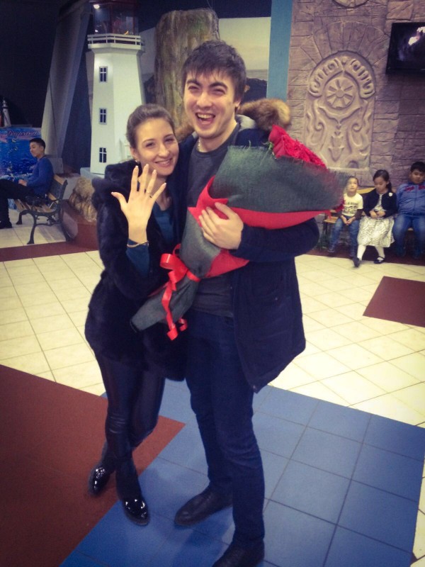 В тот день домой к ничего не подозревающей Марии приехал их общий друг Кумарбек и спросил, доверяет ли она ему, на что она ответила согласием. Тогда он надел на девушку наушники и непроницаемые очки и привез в океанариум. В это время Еркен в костюме аквалангиста забрался внутрь бассейна с заранее подготовленной табличкой, на которой было написано "Выходи за меня".