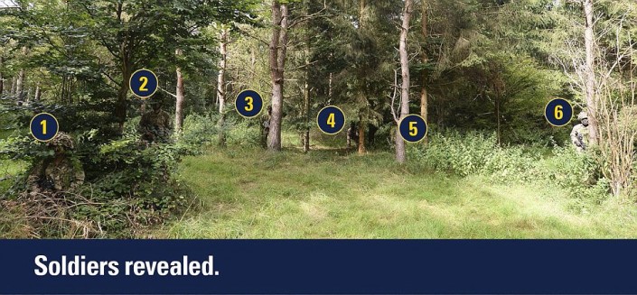 Читателям предложили найти на фотографии шестерых замаскированных снайперов. "Этот снимок был сделан в июле на равнине Солсбери. Давайте проверим, насколько вы внимательны, найдите спрятавшихся в лесу солдат", - подписано фото.