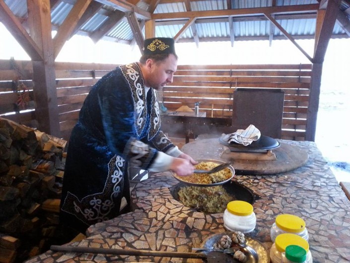 "Алексей показывает, как топится чан для омолаживающих процедур (русская баня тоже есть). Потом раскладывает приготовленный им плов. Плов из своего мяса - на ферме 500 голов овец", - написала Анна Вингурт.
