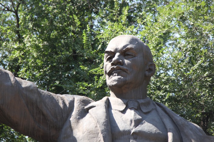 Памятник советскому вождю Владимиру Ленину возвышается в самом центре. Одна рука Ленина вытянута вперед, вторая придерживает плащ. Лицо его сосредоточено, брови сдвинуты.
