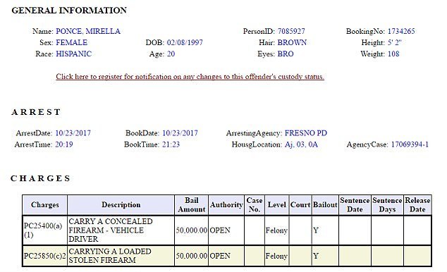 20-летняя американка Мирелла Понсе, арестованная на днях в городе Фресно (Калифорния) за незаконное хранение огнестрельного оружия, прославилась в Интернете после того, как местный полицейский департамент опубликовал ее фото на своей странице в Facebook, пишет New York Post.
