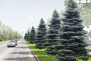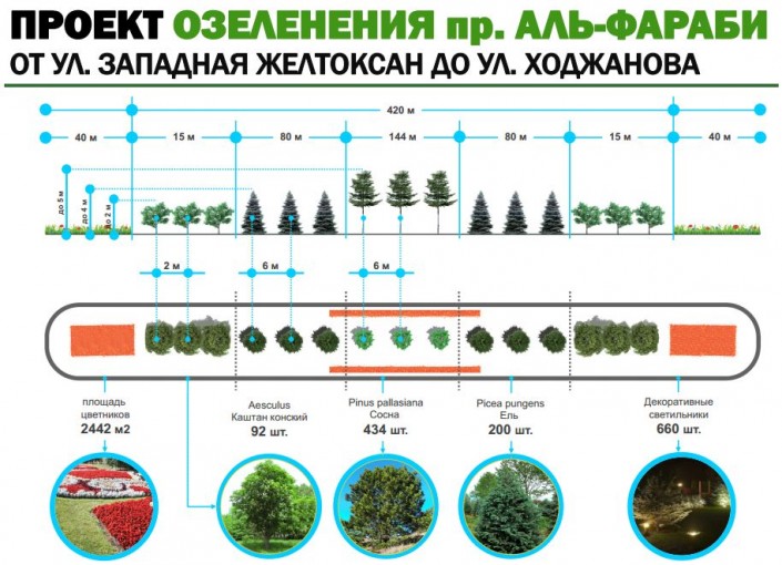 Планируются работы по высадке лиственных и хвойных деревьев на разделительной полосе проспекта Аль-Фараби от улицы Желтоксан до улицы Ходжанова. Для посадки выберут крупномерные деревья, выращенные в местных питомниках - каштаны, сосны и ели. Также будет произведена посадка цветов и кустарников на площади около 2,5 тысячи квадратных метров.