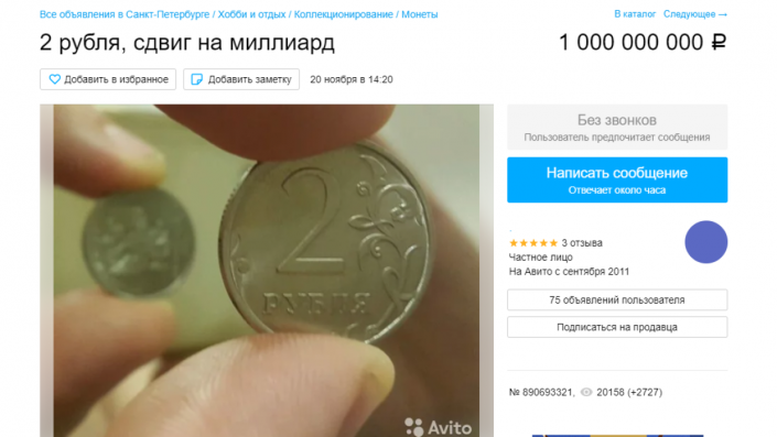 Житель Санкт-Петербурга выставил на продажу монету номиналом два рубля, запросив за нее один миллиард рублей, сообщает Tengrinews.kz со ссылкой на РЕН ТВ.